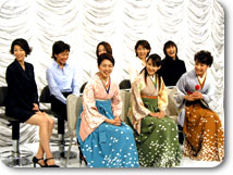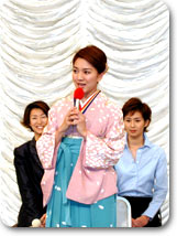 2003年1月15日(水)。外は北風がビュービューと吹き荒れる極寒の中、テレビ朝日のスタジオに、袴姿3人を含む8人のアナウンサーが集結。「voice3、今回は何をやってくれるのだろう」と、お忙しい中お集まりいただいた記者の皆さんの前で、役柄・そして意気込みなどを熱く語りました。