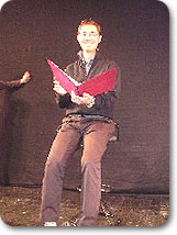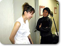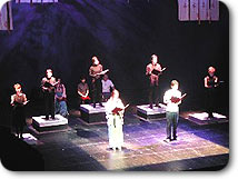 「光る道」(朗読)は、やんごとなき姫と下僕の物語。姫は十二単に見立てた袴、おのこ(下僕)は裸足で熱演。会場は一気に平安時代に。