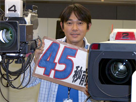 2.現場からの生中継では、手元の電波時計をみながら 時間内にコメントをおさめる。