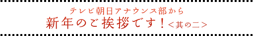 「皆様、明けましておめでとうございます!今年も、ワクワクしながら、新しい「自分」を発見していこうと思っております! 昨年、初めて訪れたポルトガル。 今から約400年前、未知の世界に危険を恐れず、 遠きポルトガルまでの航海に挑んだかつての日本人。 その勇気と開拓の精神に、揺さぶり動かされるものを感じました。 今年は、『開拓の精神』でまいります! どうぞよろしくお願いいたします。」 上山千穂 ![]() 藤井暁アナ