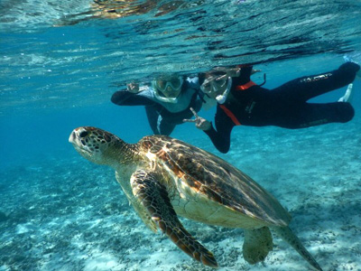 沖縄・慶良間ブルーの海で友人とウミガメと!