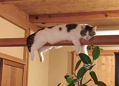 飼い猫のプラトン。鴨居の上が定位置です