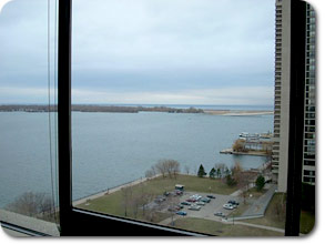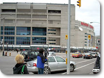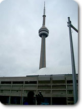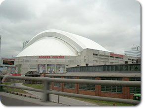 海のように広大なオンタリオ湖を右手に見ながら進むと、前方に有名なCNタワー(553.33メートル)、その下に目的地ロジャーズセンターが姿をあらわしました。 |