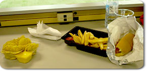 右から、ホットドック、ポテト、ティッシュペーパー、スナックです。