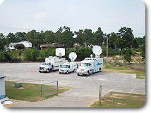 球場内の駐車場には巨大な中継車が。おわんを天に向けています。 |