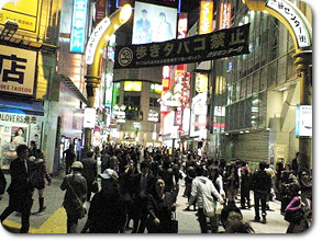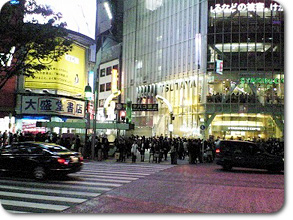 駅前のスクランブル交差点はたくさんの人と車。 |