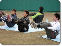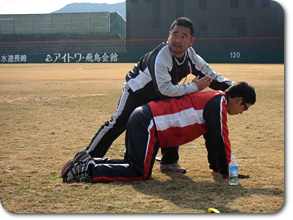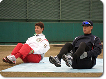 徹底的に指導されたのは、はやり【体幹トレーニング】 一言で言えば【胴体】のことですが、体の特定部位(例えば肩やひじ、膝)に 掛かる負担を軽減させ、かつ筋力を最大限発揮するために、 今最も重視されているトレーニングです。