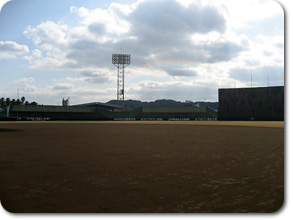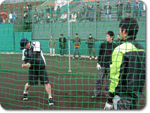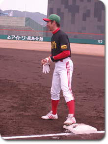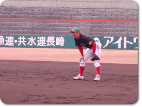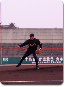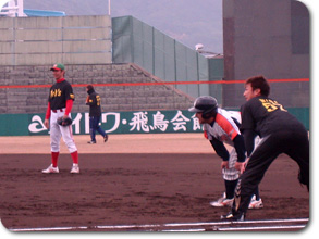 球場に戻り、佐世保名物『佐世保バーガー』を食べて一息ついたあとは、 これまた自主トレ恒例という地元軟式野球チームとの真剣勝負!