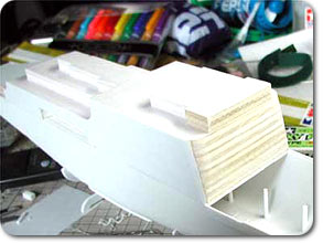 フルスクラッチ(完全自作)といっても素人がやることですので、船体下部のみは既存の貨物船の模型を改造することにしましたが、他はすべて手作りです。図面引きから始まり、実質10日間で完成させなければならなかったのですが、その後万景峰号自体が来なくなったので締め切りが延長され、最終的には25日間で完成しました。