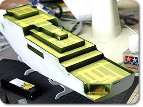 甲板を緑色に塗装し、マスキングテープを貼ります |