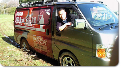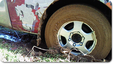 前日の雨でぬかるんだ地面にタイヤをとられ、 完全にはまってしまいました…(涙)
