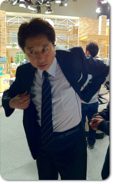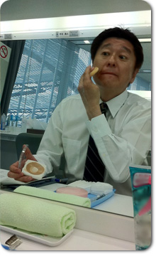 この後着替えて、ドウラン塗って粉はたいて(テレビの出演者は顔が照明でテカテカしない様に、化粧するのです。ご存知?)