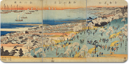 桜が咲く御殿山の方から俯瞰で描いています。左側から海沿いに品川宿の町並みが… |
