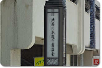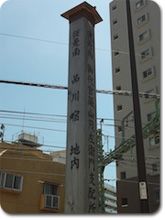 手前に傍示杭(木の標識)が立っています。それを再現した、「ここから品川宿」を表示する傍示杭の前で現在の様子を撮影してみました。