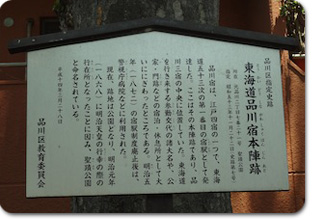 なんとなく懐かしい雰囲気の商店街を歩くと、地元のおばさまに声をかけられました。息子が「東海道を調べています」と言うと、「じゃあこちらに資料があるからどうぞ」と、地元のまちづくりを進める「NPO 東海道品川宿」 プロデュースのお店に私たちを招き入れました。「歴史に興味を持つと楽しいよね」なんて、品川宿の歴史を語ってくれました。地元の歴史と文化を多くの人たちに伝えて行きたいという熱意が伝わってきました。商店街を進んで行くと途中、本陣(大名や旗本、幕府の役人だけが泊まれる宿泊所)の跡があり、今は公園になっていました。