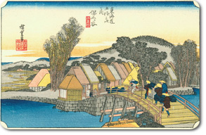 安藤広重は帷子橋(かたびらばし)(当時は新町橋とも呼ばれていた)とその先に見える保土ヶ谷の宿を描いています。
