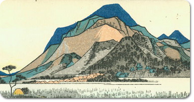渡った向こう側には田畑が広がっていて、その先が小田原の宿。右寄りに小田原城が小さく見えます。奥にそびえるのは箱根の外輪山・明神ケ岳。右側には富士山のシルエットも…。