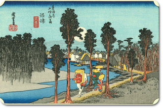 本来、夕方の西空に満月が浮かんでいることはありませんから、旅人が西へ向かっているとすると、これも広重の想像の構図になります。