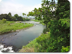 絵と似たような場所を探しましたが、現代の沼津は、多くの住宅、マンション、工場などが建ち並び、なかなか雰囲気の似ている場所を探すのは困難。狩野川支流の黄瀬川沿いで撮影ポイントを見つけました。それが冒頭、右側の写真です。