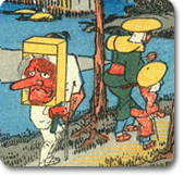 狩野川沿いを歩く、大きな天狗の面を背負った白装束の男性とひしゃくを持った母と娘は金比羅詣り(四国 金比羅宮への参詣)の旅人だそうです。
