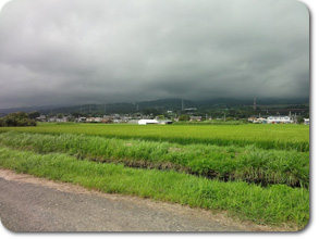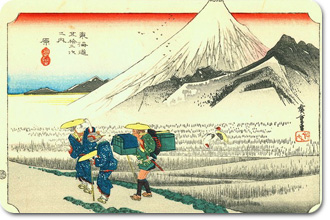旧東海道(現在の県道163号)沿いの原の宿があった場所は、住宅や商店が建ち並んでいて絵のように景色がひらけていないので、やや北上して国道1号沼津バイパスを越えて田が広がるあたりまで行って撮ったのが上の右の写真。本来なら、広重の絵ほどは大きくないものの、富士山の姿が真正面に見えるポイントです。この日はあいにく雲がかかっていました。