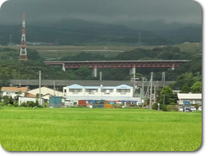 田んぼだけを見れば江戸の頃と同じような風景ですが、現在そこに鶴の姿はなく、先には住宅が、更に先には現代の大動脈・東海道新幹線が…時折、あっという間に白い車両が右に左に駆け抜けていきます。更に奥、赤く見えるのは東名高速の高架橋です。