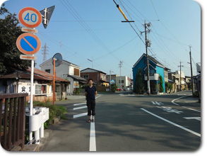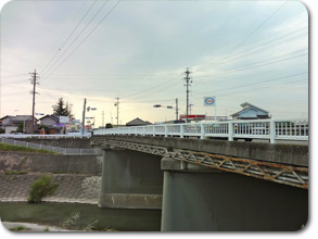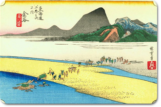 島田の川越遺跡から県道381号を通って川を渡りきる少し手前で振り向いて撮ったのが右上の写真。何となく背景の山の形が広重の作品と似ていました。でも、左上の絵の中、山裾に描かれている集落が金谷宿だそうなので、実際は振り向かないで前を見た方が正しい構図になります。 前回の「島田」と同じく、まるでアリの行列のように小さく大名行列を描き、大井川を越すのがいかに大変かを強調しています。