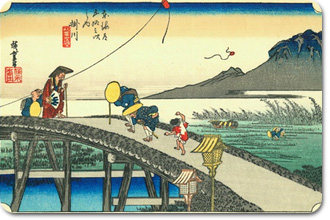 広重の絵のタイトルは「秋葉山遠望」 掛川の大池橋から見える秋葉山(あきはさん)【赤石山脈最南端・天竜川の上流にある山】を右側に、秋葉山本宮秋葉神社(あきはじんじゃ)詣をする旅人と僧侶が橋の上ですれ違う様を描いています。実際にはここから絵の様に山は見えませんが、もともとこの橋を渡ったところに大きな鳥居が建っていて、ここは東海道から秋葉街道が分岐する場所だそうです。 凧が揚がっていたり、糸が切れて飛んでいってしまっていたり…これはこの地方に伝わる【横須賀凧】でしょうか?