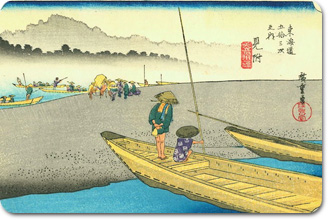 広重の「見附」は、「天竜川」池田の渡し。 池田の渡船関係者が、武田軍が攻めて来た時に徳川家康に味方したことから、今から約440年前の1573年天竜川渡船権のお墨付きをもらいました。 1878年(明治11年)に木の橋が完成するまで、「池田の渡し」は東西交通の役割を担ってきました。