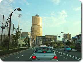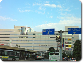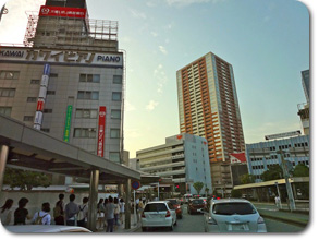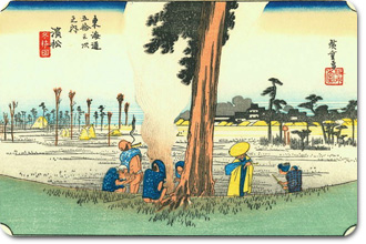 広重の「濱松」は、「冬枯ノ図」 大きな木の根元で焚き火をして暖をとっている人々の姿。遠くに浜松城、右手にざざんざの松(室町6代将軍足利義教がこの松の下で宴を開き「浜松の音はざざんざ」【ざざんざ=風が松に吹く音】と謡ったそうです)も見えています。現在は、この絵とうってかわって大都会。