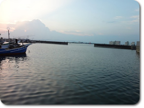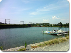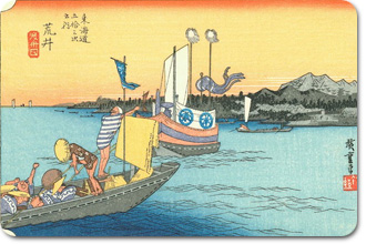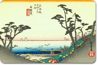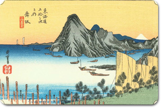 広重の「舞坂」のタイトルは「今切真景」 今切とは、遠州灘と浜名湖を結ぶ水路・今切口(いまぎれぐち)のこと。今から約510年前室町時代の1498年(明応7年)に起きたM8.9の大地震によって、砂州が決壊して出来上がったと言われています。「今(最近)切れた」から今切と言うようになったそうです。この地震は、東日本大震災以降特に注目される東海・東南海・南海の三連動地震だったのではと見られていて、きっとこの時も大津波がこの辺りだけではなく、太平洋沿岸を広い範囲で襲ったことでしょう。それ以降、浜名湖では渡し船による東西の往来が始まりました。