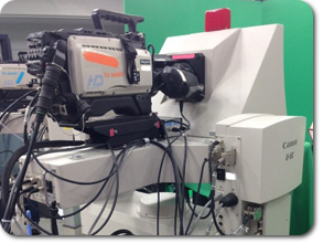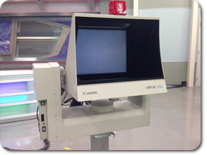 天井に原稿を撮るカメラがあってここからケーブルが繋がって正面のプロンプターカメラに原稿の文字を映し出してくれる。つまりアナウンサーが手元の原稿見て、前を見て、また手元を見て、また前を見るといったことをしなくてもすむ機械です。