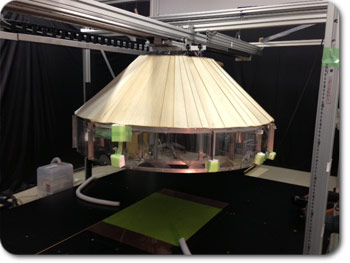 さらに、住宅街の模型を通り越して平らな場所の上を通ると、今度は再び、芯が現れしっかりとした竜巻の形状が再現されたのです。