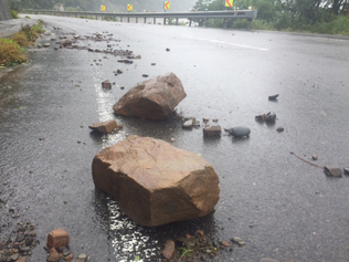 現場に駆けつけてみると、警察や地元の消防も到着し国道が封鎖されていました。近くでは巨大な波が道路上にまで押し寄せ、大きな岩や木が海から打ち上げられていました。
