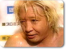 佐々木健介との試合を終え、若手の肩を借りずに一人で引き上げてきた高山さん。