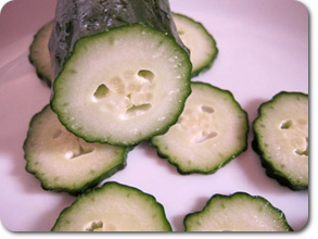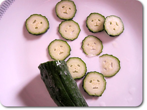 確かに!!どうやらこのキュウリ、輪切りにすると顔の形に見える小さな空洞があるようで、まな板の上にはいくつものキュウリちゃんとキュウリくんが・・・。