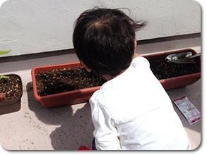 種を植える時、息子も手伝ってくれました。寝癖がすごいですね(笑)