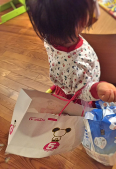 お風呂上りに「ゴーちゃん。」の紙袋を持って「バイバーイ」と言いながら家中をぶらぶらとお買い物。最近の娘のブームです(笑)。紙袋の中を見てみると、おもちゃやボール、私の手帳や携帯電話が入っていることも!本当に、目が離せない時期に入ってきました。