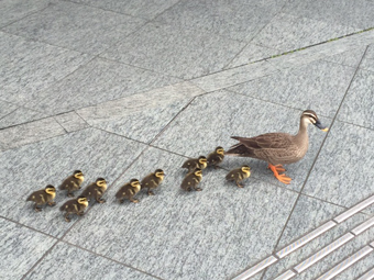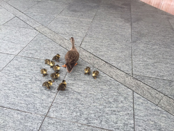毛利庭園のカルガモ親子がテレビ朝日前までお散歩にきたのでしょうか!?小ガモ達が「ピヨピヨピヨ~」と、何とも愛らしい声を出しながらお母さんの後をついて歩いている姿が可愛過ぎて、しばらくその場に立ち尽くしてしまいました。。。