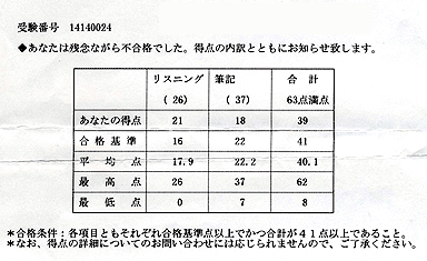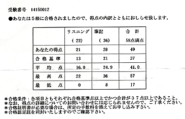 さあて、5級4級ともに、結果通知の「得点内訳表」をごらんください。「あなたの得点(つまり私の得点です)」という欄と、「合格基準」・「平均点」の欄とを見比べるのがオススメです(笑)