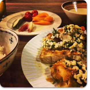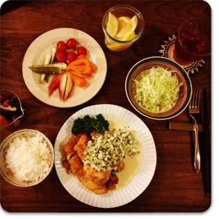 鶏南蛮。前日しこんだピクルスでタルタルソース。ごはんは土鍋炊き。