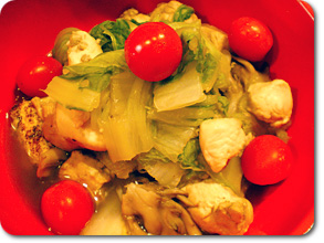 焼き豆腐と白菜と鶏胸肉と舞茸の煮物に、ミディトマトを加えたら、
