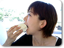 饅頭をほおばる松尾。結構大きいんです |