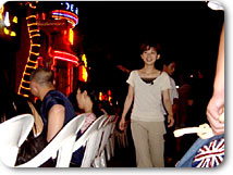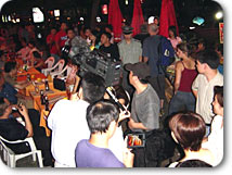 夜の三里屯の通りには、赤・緑・黄など、色とりどりのネオンに囲まれたバーがズラリと並んでいました。店の外のオープンバーも光で覆われていてとっても賑やか。店の中ではバンドが演奏をしています。 |
