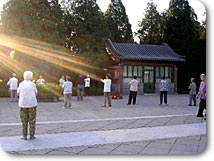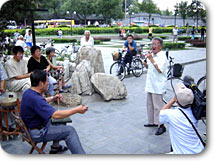 ひんやりとした空気と柔らかな日差しの中、北京っこたちは、石畳の広場を利用して、思い思いの方法で体をほぐしていました。公園で見かけたのは、太極拳、体操、社交ダンス、紫や赤などのふさふさの扇子を用いたダンス、ローラーブレードをしている人、さらには「ほっほーい」という声。ん? |