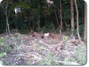 放し飼いで伸び伸びと羽を伸ばす鶏の群れに、
