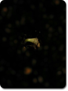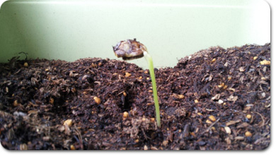 すこーし割れて黄緑色の何かが生えてきたような豆らしきものの姿が。