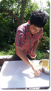 何を作っているんだろ・・・中力粉をこねて・・・ |