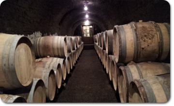重い扉を開け、ヒンヤリとした蔵の中に樽が。ここでワインを寝かせます。