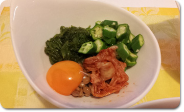 オクラ、めかぶ、納豆、それにキムチと卵をのせて。